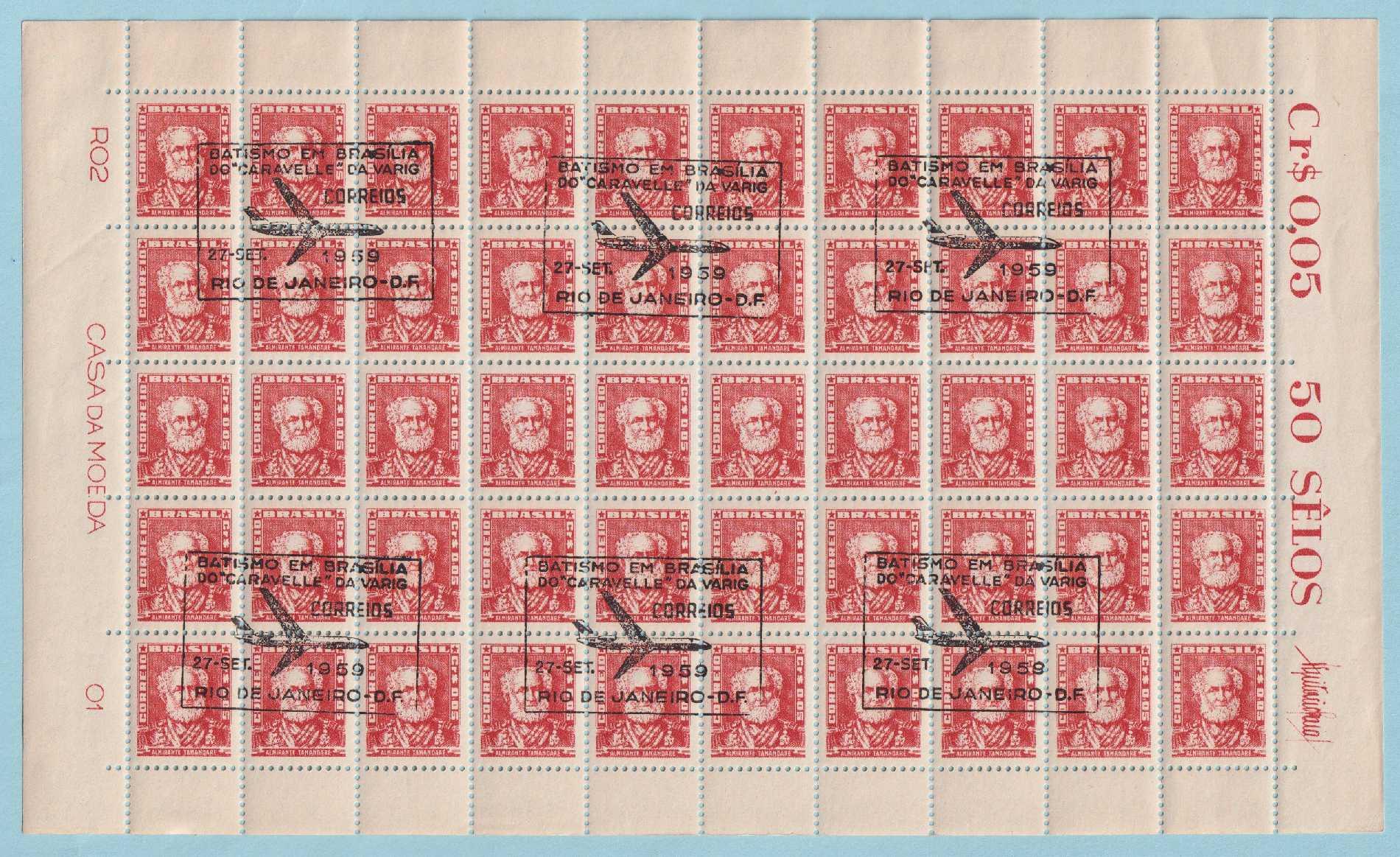 BRAZIL 787 WITH RARE CANCEL? ** SHEET OF 50 STAMPS - Brazil, block of stamps with VARIG commemorative stamp of September 27, 1959, Baptism in Brasília of the CARAVELLE plane  - Z106